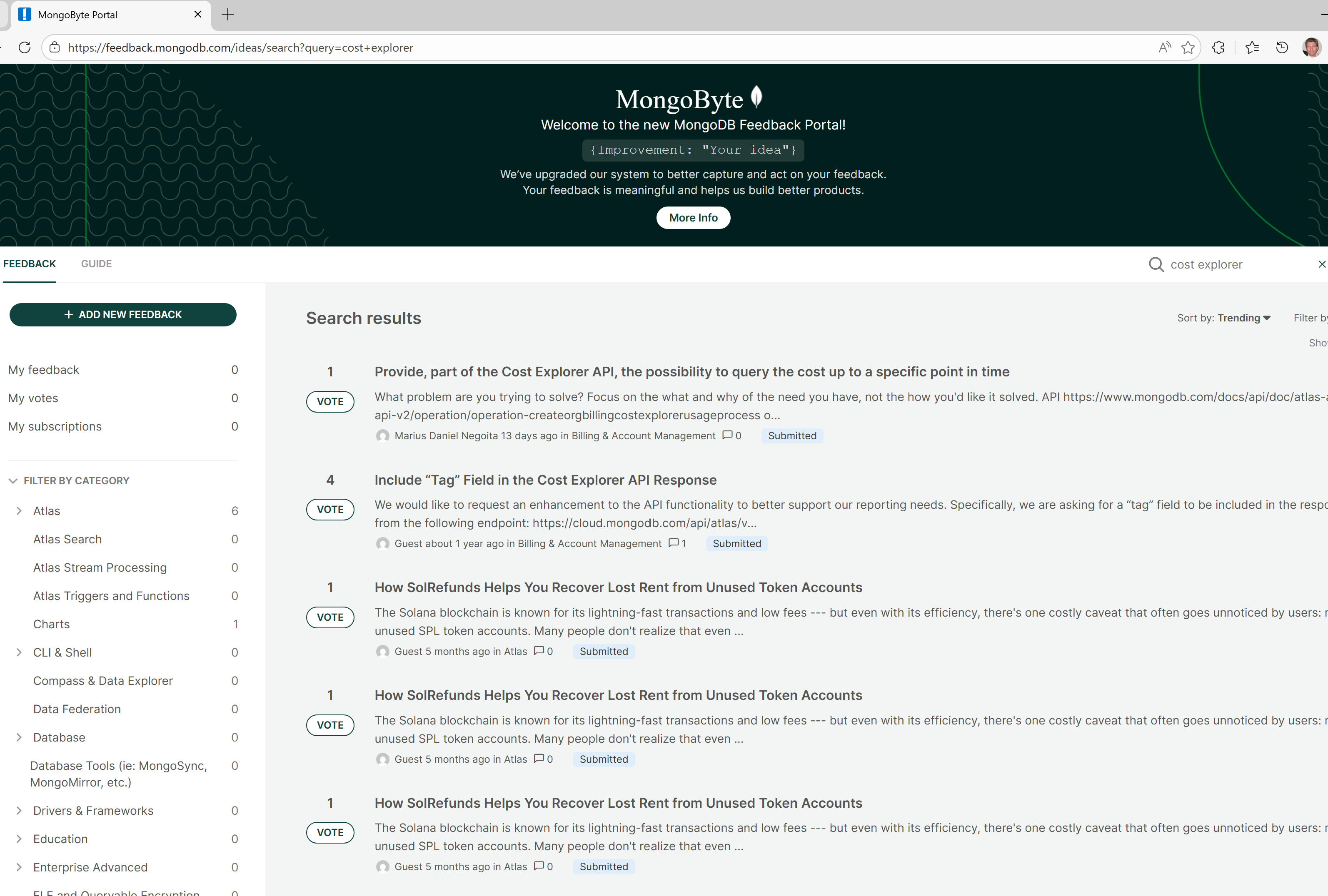 There are some spam posts in this here Mongo feedback portal from some blockchain marketers, including "SolRefunds". Would be nice to not have those cluttering the search results, and to not give spammers a venue. Example screenshots attached, from a search for "cost explorer". |